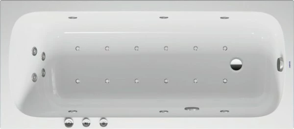 - Bedienung der Whirlfunktionen sowie Steuerung der Strahlintensität erfolgt über auf dem Wannenrand angeordnete Pneumatikschalter und Luftregler.