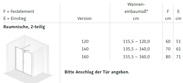 In besonders breiten Nischen oder am Kopf von Schlauchbädern ist die 2-teilge Exklusiv 2.0 Raumnische die beste Wahl. Die Kombination aus feststehendem Seitenteil, pendelbarerer Tür, innovativem Wandanschlussprofilen und dem geradlinigem Stabilisationsbügel lässt die Duschkabine in einem frischen Look erstrahlen.
