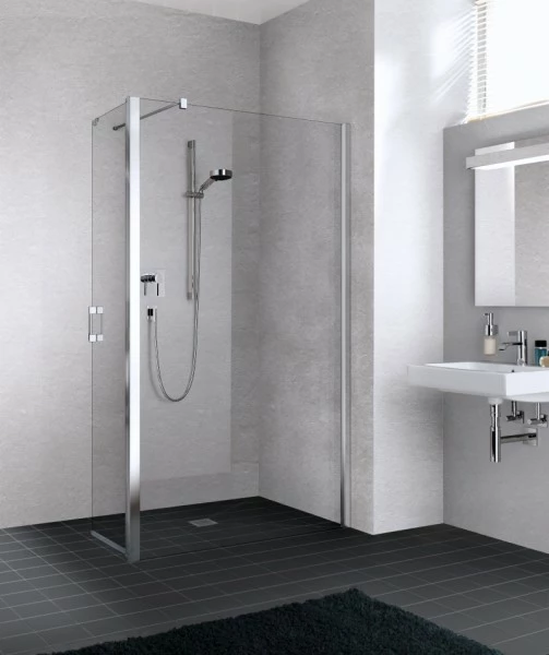 - Teilgerahmte WALK-IN-Glasanlage mit beweglichem Flügel, 90° nach innen und außen schwenkbar, mit